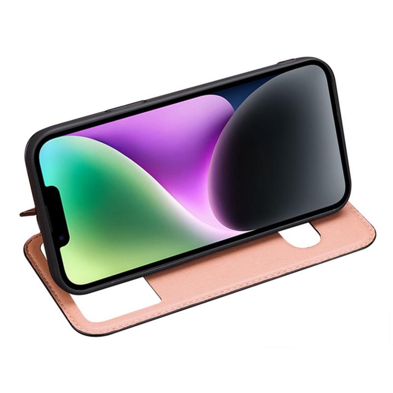 Støtsikkert deksel til iPhone 14 Anti-slipp telefondeksel med to vindu til mobiltelefon i ekte okseskinn med stativ
