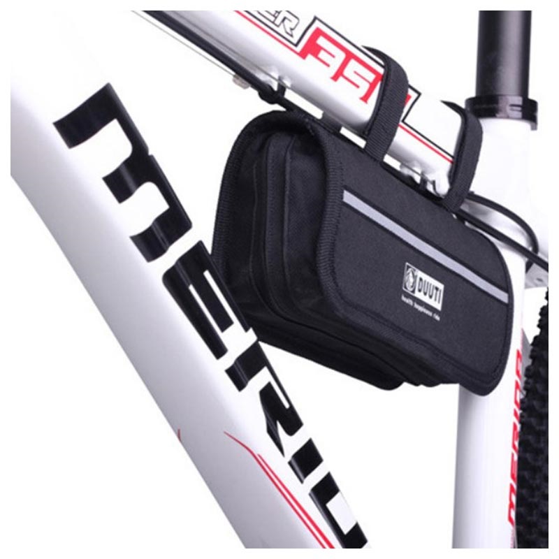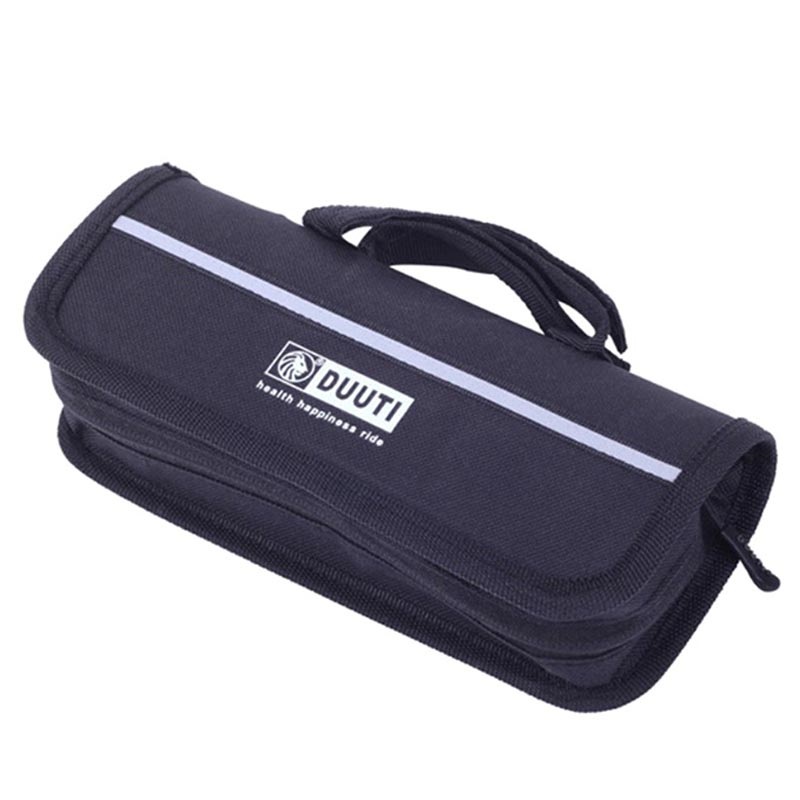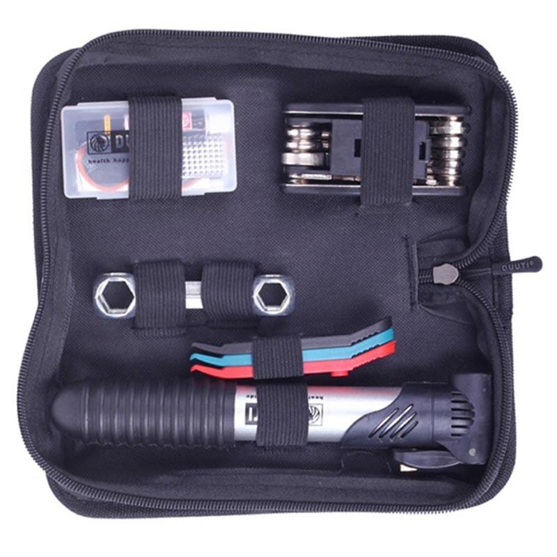 The Duuti bicycle tire repair tool kit contains everything you need to patch a punctured tire. Neatly packed in a lightweight, convenient polyester bag, are all the tools to remove, patch, and pump your bicycle tire. The Duuti tire repair kit effortlessly straps onto any bicycle, making it essential on your bike trips.