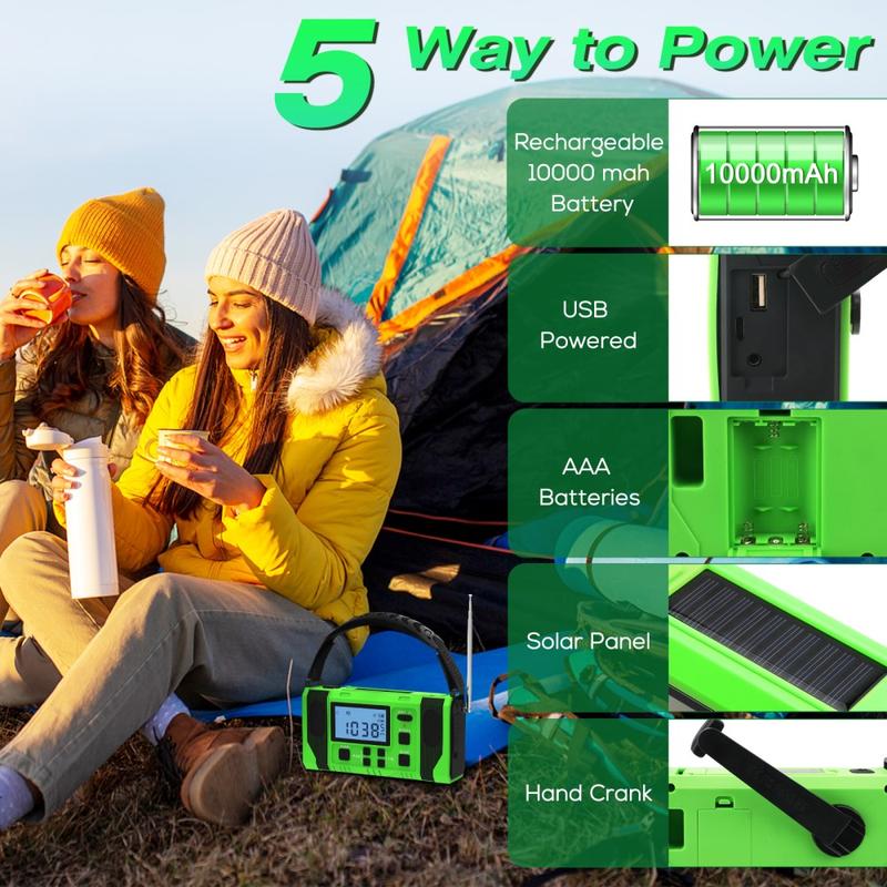 Du vil aldri stå uten strøm takket være fire allsidige lademetoder: Solcellepanel (0,1 W), håndsveivgenerator, Type-C-inngang, AAA-batteribackup (AAA-batterier ikke inkludert). Dette sikrer at radioen alltid har strøm i nødsituasjoner, på campingturer, i uvær og på fjerne eventyr.