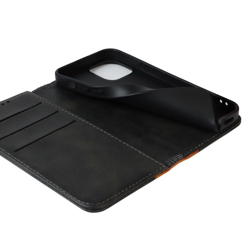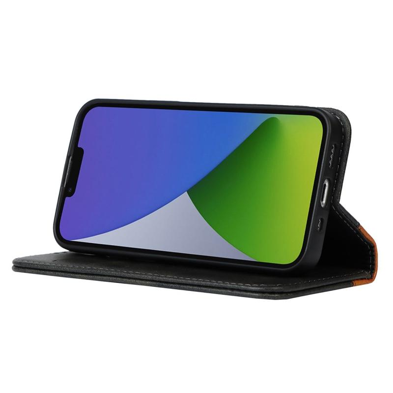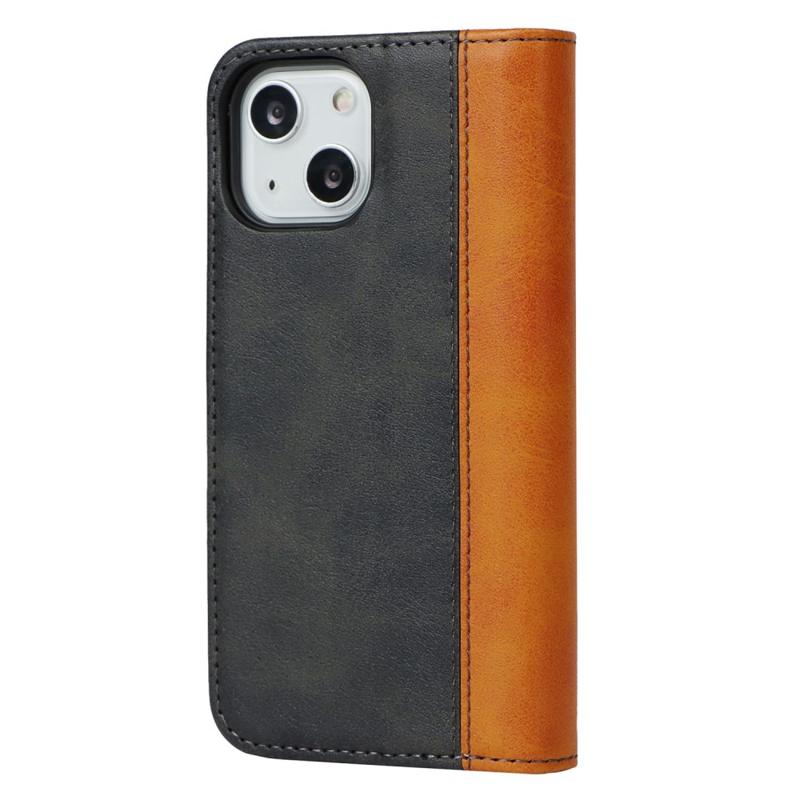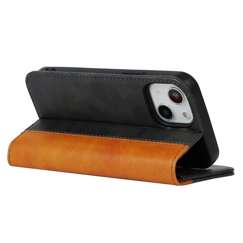 For iPhone 14 Bi-farge skjøting Magnetisk autoabsorbert kalvetekstur PU-skinn telefondeksel Dropsikkert deksel til lommebokstativ