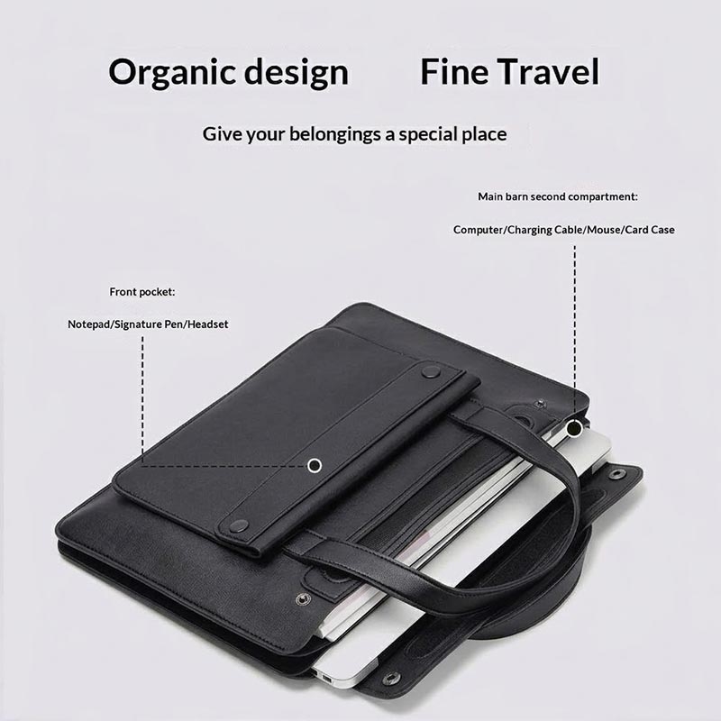 Denne bærbare datamaskinvesken for 13,3- og 14-tommers bærbare datamaskiner er designet for brukere som ønsker en ryddigere, mer organisert og stiligere måte å bære sine daglige nødvendigheter på. Med sin elegante, trekkspillinspirerte struktur, praktiske oppdeling i flere rom og profesjonelle polyuretanfinish egner den seg godt til pendling, kontorbruk, møter, studier og reiser.