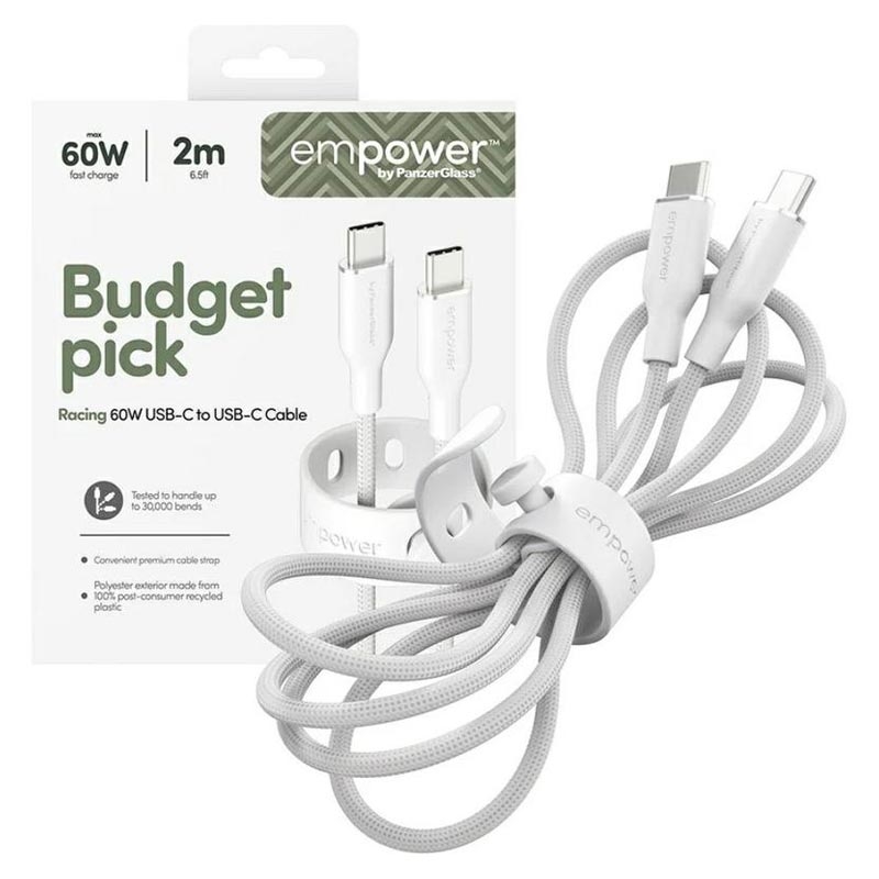 Empower by PanzerGlass Racing USB-C til USB-C-kabelen er laget for hastighet og holdbarhet, og støtter rask 60W-lading for en lang rekke USB-C-enheter. Den ultramyke, flokefrie designen gjør den enkel å bruke til daglig, mens resirkulerte materialer gir denne førsteklasses kabelen et bærekraftig preg.