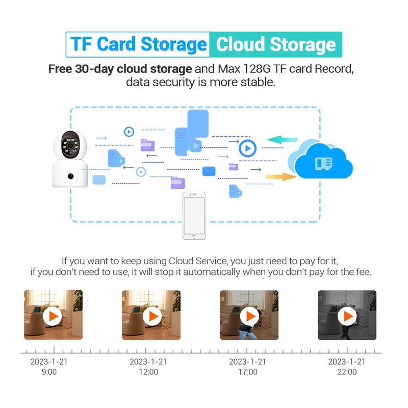 Støtter opptil 128 GB TF-kort og skylagring (gratis 30 dagers skylagring)