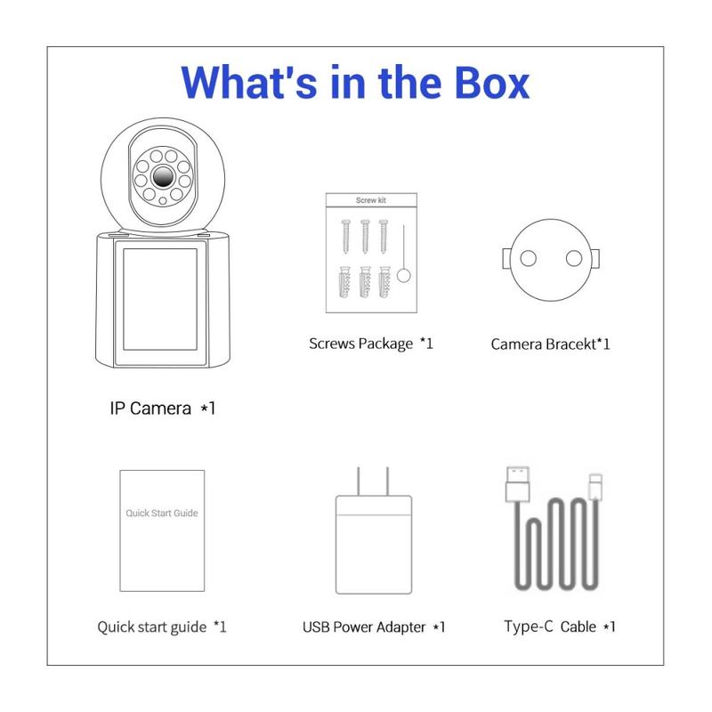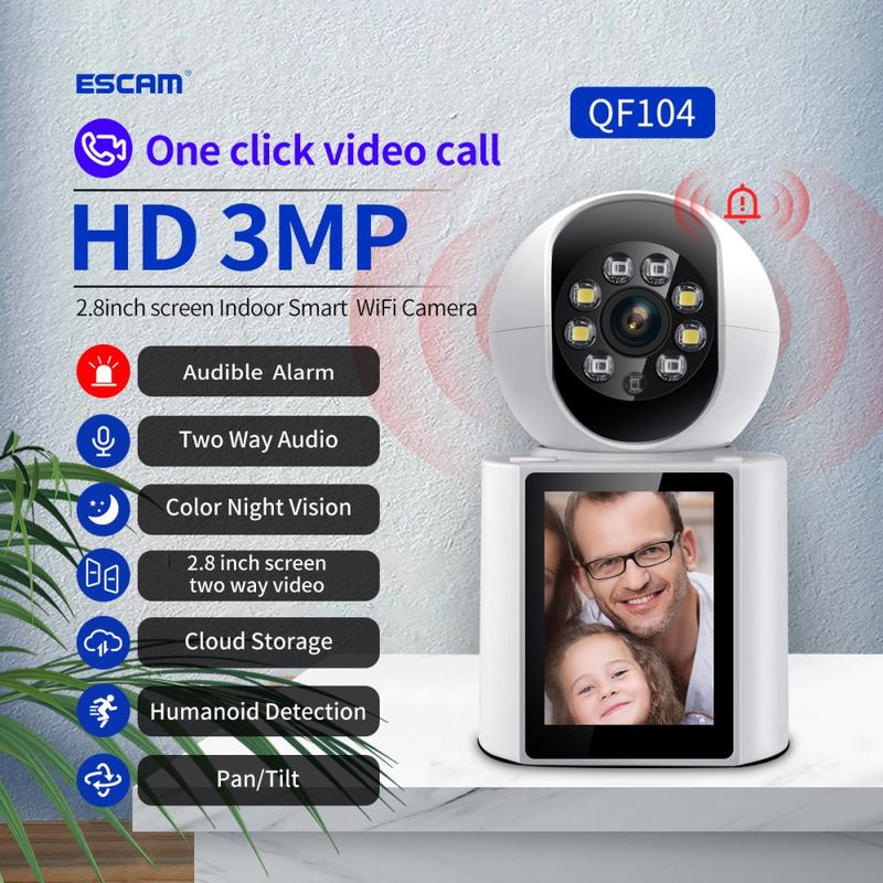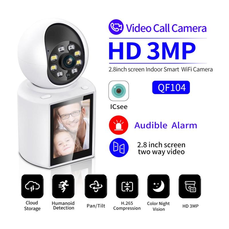 Overvåk hvert hjørne av et rom, snakk med familien og motta smarte varsler med ett kompakt innendørskamera. QF104 tar opp i skarpe 3 MP-opptak, leverer ekte toveis lyd og lar besøkende starte en videosamtale ved å trykke på en enkelt knapp på den innebygde 2,8-tommers skjermen.