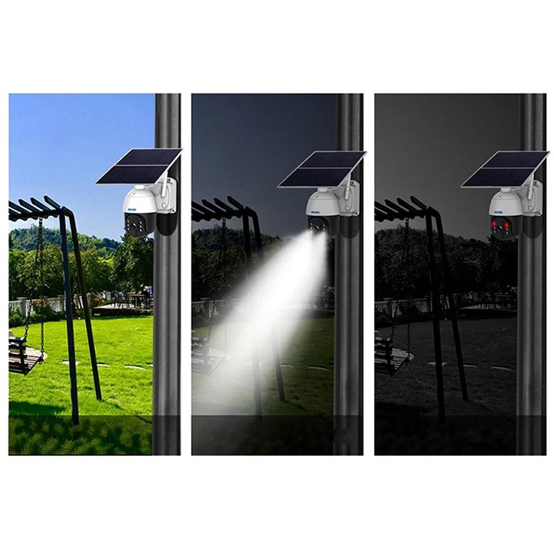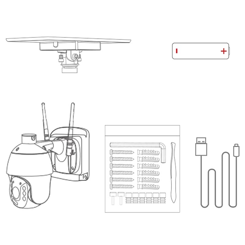 sikkerhetskamera og følg utviklingen via en tilkoblet applikasjon på et realistisk bilde med 3 millioner piksler! Med et avtakbart solcellepanel og 30000mAh batteri kan den ta opp videoer 24/7, som du kan lagre på skylagring eller et 128GB TF-kort (kort er IKKE inkludert). Den har også dobbel lys fullfarge nattsynsfunksjon, en innebygd mikrofon og høyttaler (støtter toveis lydintercom), og en PIR-alarmsensor med nøyaktig sanntidsalarm på mobilappen.