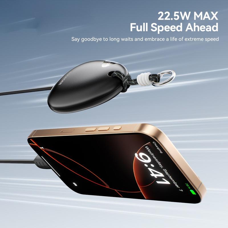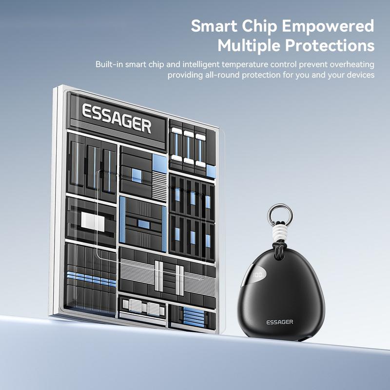 ESSAGER 10000mAh Fast Charging Power Bank tilbyr pålitelig strøm på farten med en innebygd 70 cm uttrekkbar Type-C-kabel. Den er designet for reiser, pendling og utendørs bruk, og leverer opptil 22,5 W hurtiglading samtidig som den er kompakt, lett og enkel å bære takket være den integrerte karabinkroken.