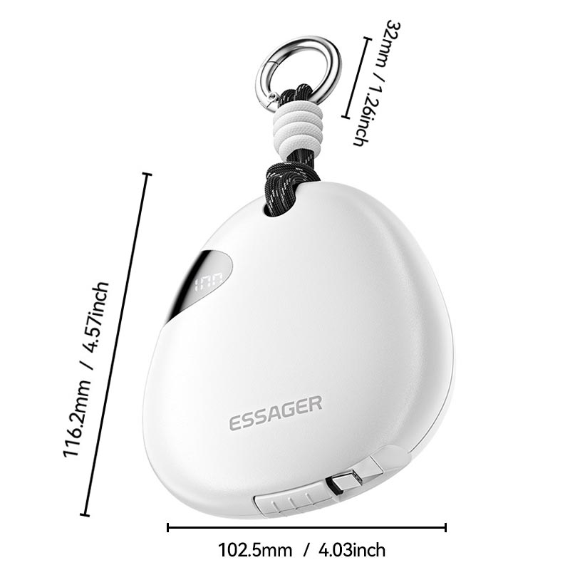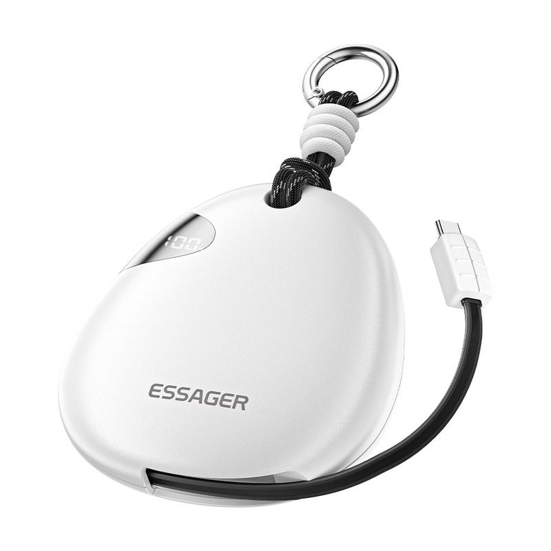 ESSAGER 10000mAh Fast Charging Power Bank tilbyr pålitelig strøm på farten med en innebygd 70 cm uttrekkbar Type-C-kabel. Den er designet for reiser, pendling og utendørs bruk, og leverer opptil 22,5 W hurtiglading samtidig som den er kompakt, lett og enkel å bære takket være den integrerte karabinkroken.