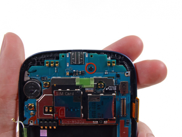 Ikke prøv å fjerne frontkameraet ennå. Kabelen er fortsatt koblet under hovedkortets lyssensor.