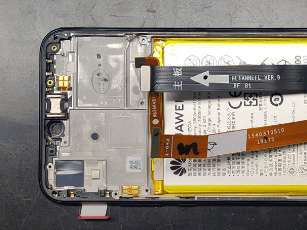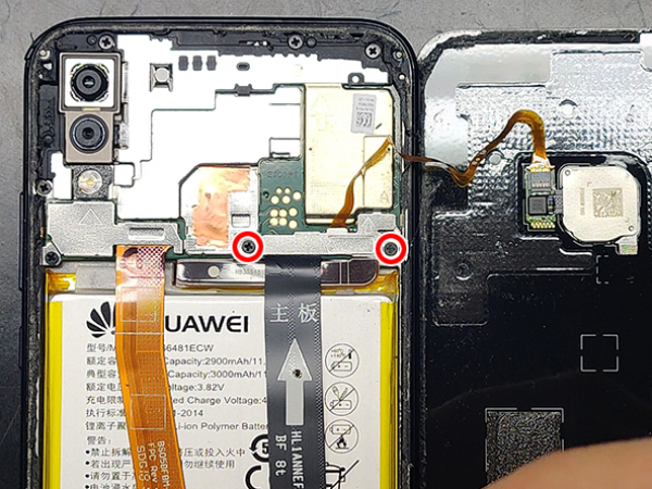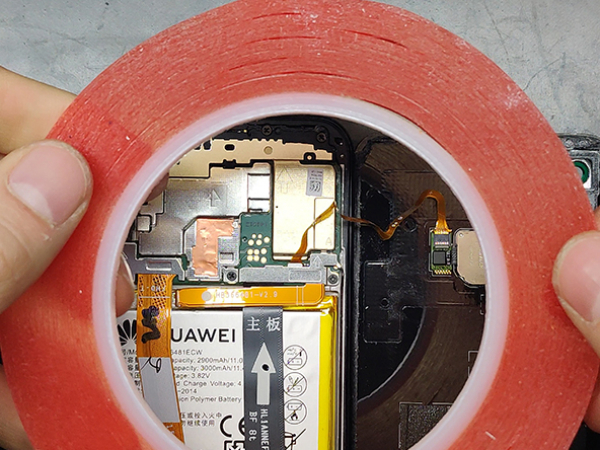 - Slå av Huawei før du begynner å demontere. - Sett det tynne åpningsverktøyet av metall mellom batteridekselet og rammen. - Vend dekselet forsiktig til høyre på telefonen. - Fingeravtrykk-ID-sensorkabelen er festet til bakdekselet.