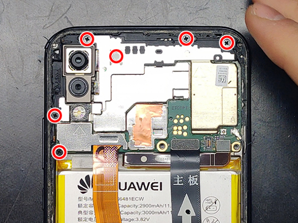 - Fjern toppskjoldet. - Koble fra og ta av frontkameraet. - Koble antennekabelen forsiktig. - Koble fra og ta ut de to hovedkameraene. - Lirk og fjern hovedkortet fra telefonen.