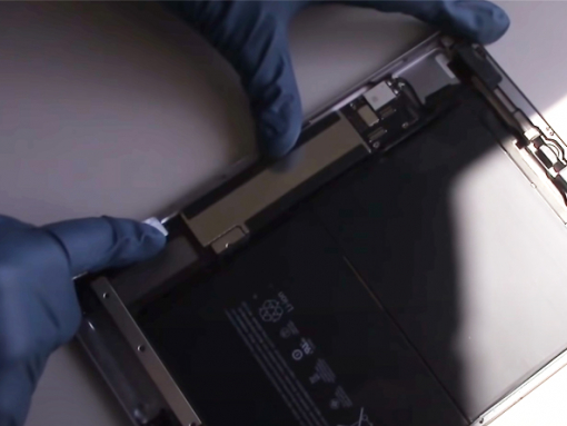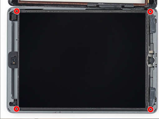- Fjern de fire Philips-skruene i hvert hjørne av LCD-skjermen. - De to skruene på toppen er skjult av svart tape. - Løft opp et av hjørnene på LCD-skjermen for å starte fjerningsprosessen. - Vær forsiktig fordi noen av kablene fortsatt er koblet til. - Fjern metalldekselet ved å skru av de tre phillipsskruene. - Bruk det nysgjerrige verktøyet til å løfte opp metalldekselet. - Koble fra resten av digitaliseringskablene.