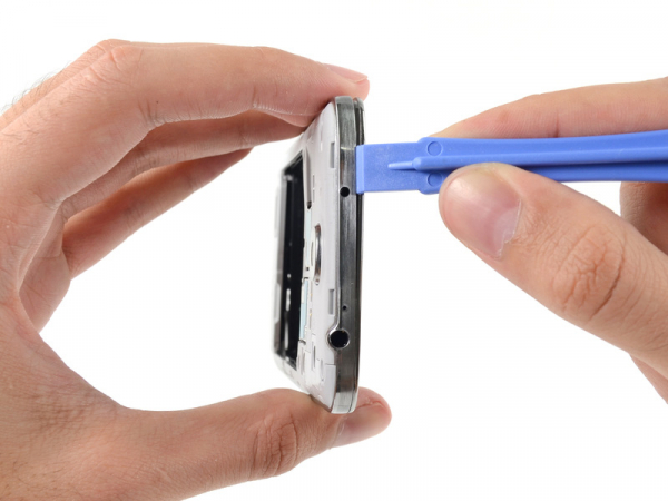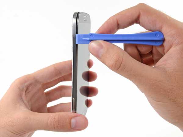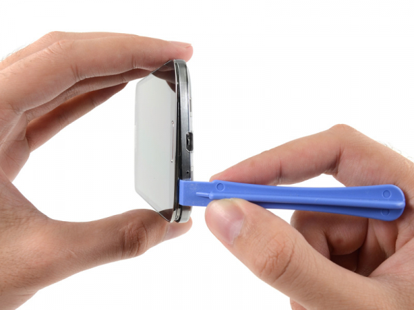 Sett inn plaståpningsverktøyet mellom kromrammen og baksiden av skjermglasset på den siden hvor volumknappen befinner seg.