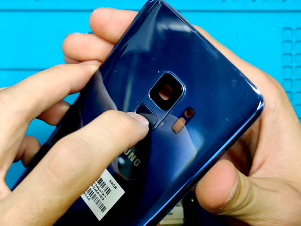 Fingeravtrykkskanneren forblir limt ned på det bakre glasset.