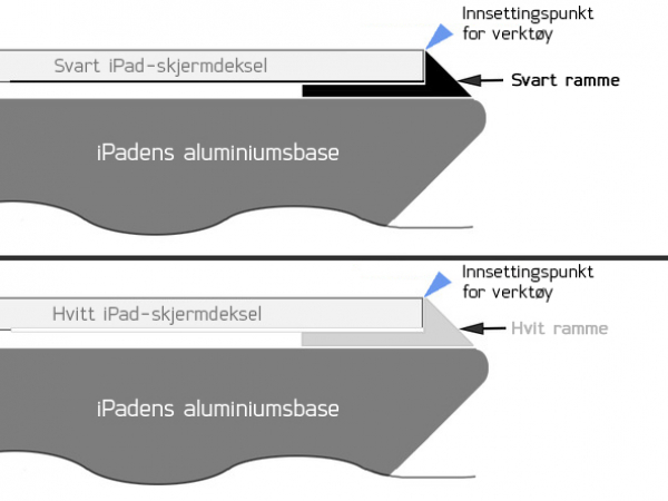 Ta tak i iPaden i øvre og nedre høyre hjørne og roter frontglasset bort fra iPaden.