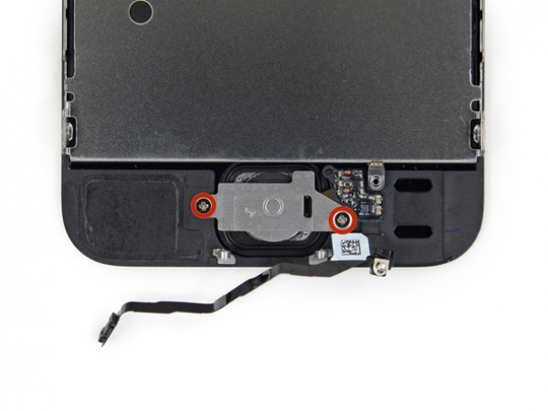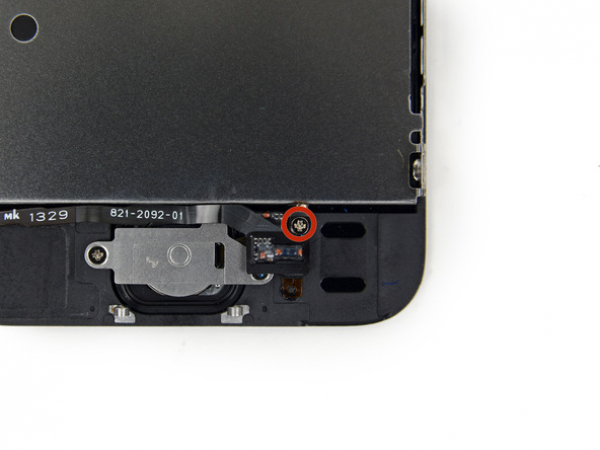 Skruen er festet til hjemknappens kabel med en fjærkontakt. Når du starter remonteringsprosessen må du sørge for at kontakten er i riktig retning. Den bør være på siden av skruen nærmest skjermen.