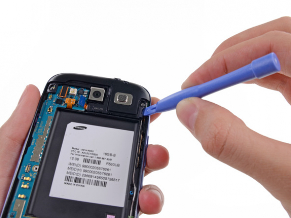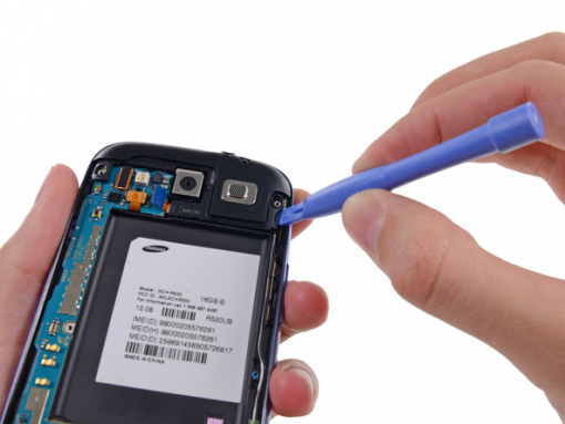 Insert the opening tool into the small notch above the battery and lever it carefully.