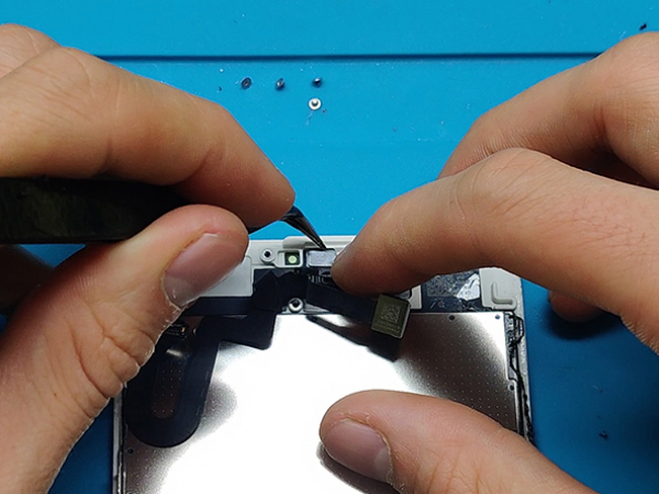 Use an opening pick to gently separate the adhesive holding the home/Touch ID sensor cable to the back side of the display panel.