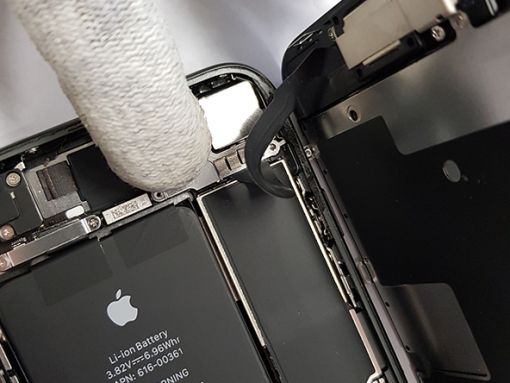 - Remove the SIM tray. - Remove the two pentalobe screws at the bottom edge of the phone. - Slide an opening pick between the display and the frame. - Progress slowly along the edges. - Open the iPhone by swinging the display up from the left side. - Do not completely separate the display from the back case, several ribbon cables which connect it to the logic board are fragile and may be damaged. - Opening the phone's display will endanger its waterproof features. - Make sure you have prepared replacement seals before you start with the repair. Tip: - If your display glass is cracked, keep further breakage contained and prevent bodily harm during your repair by taping over the glass. - Use a heat gun (hair dryer) around the edges of the iPhone for about a minute in order to soften up the adhesive underneath.