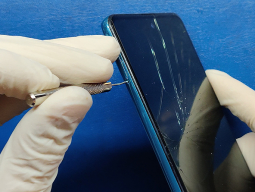 Insert the thin metal opening tool between the metal frame and the back cover of the phone.