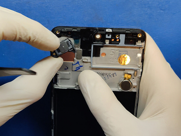 Use your tweezers to pry the speaker out of the old LCD assembly.