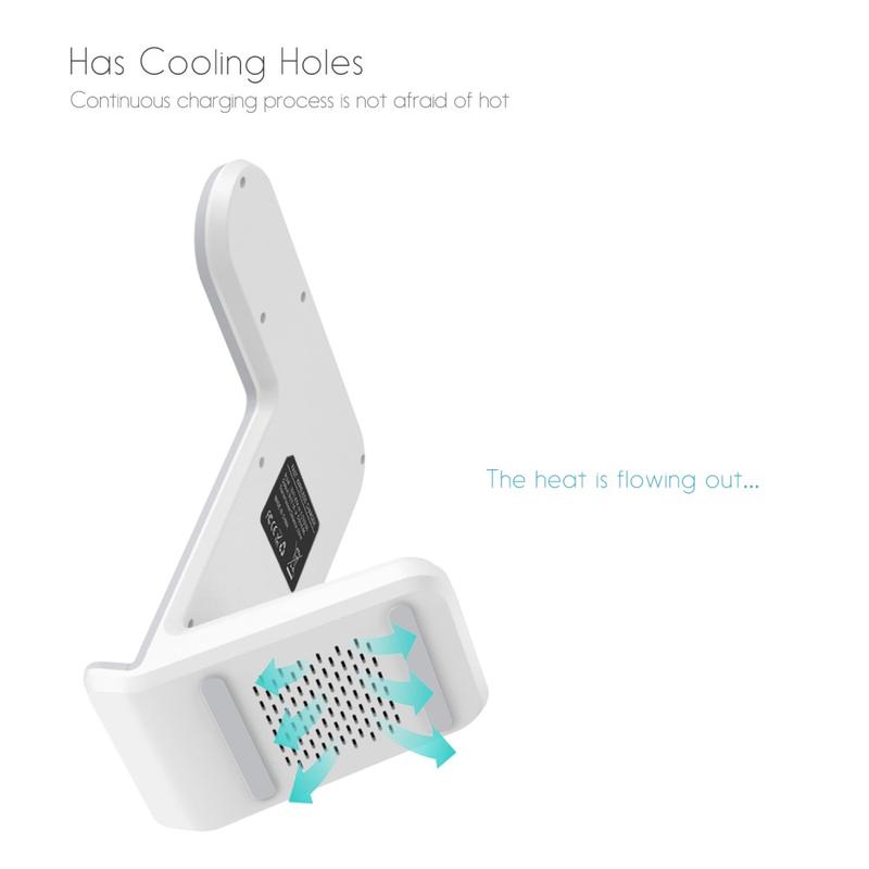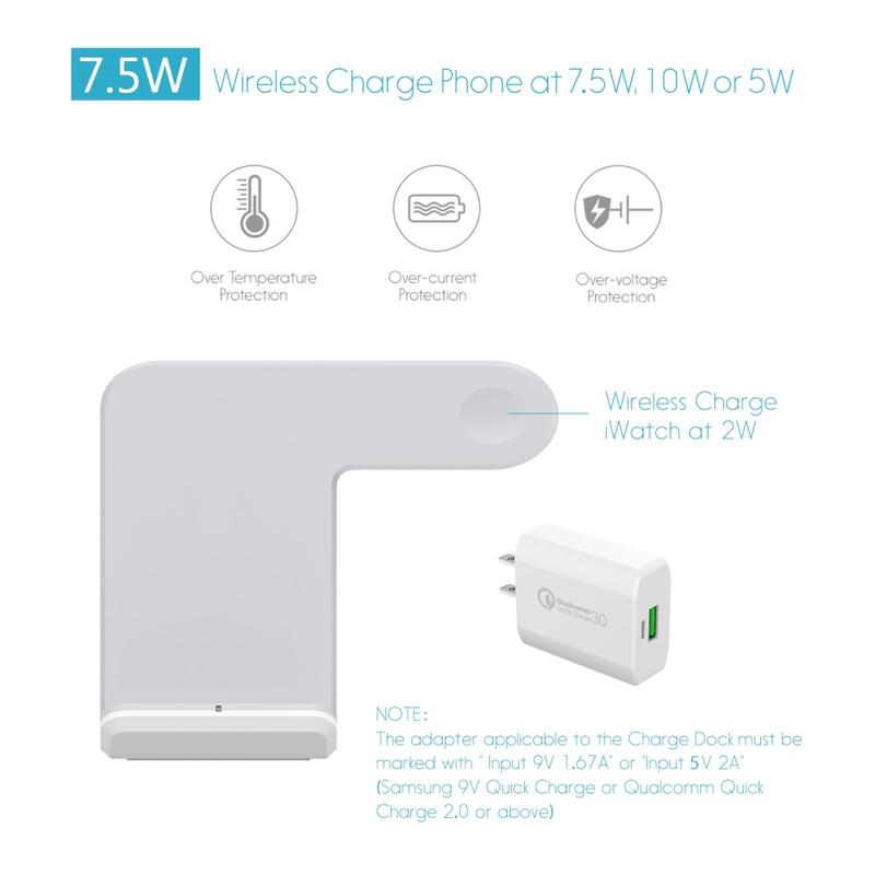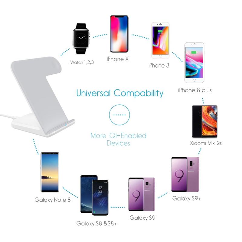 2W, 5W, 7,5W og 10W utgangseffekt, støtter hurtiglading for Qi-aktiverte smarttelefoner og Apple Watch.