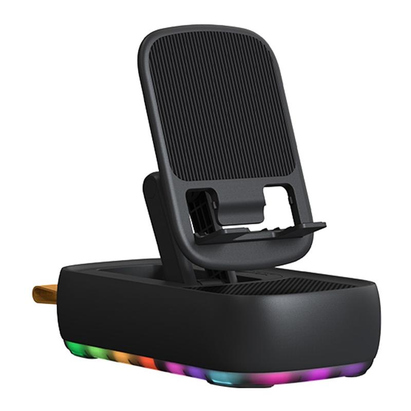 F15 3-i-1 sammenleggbar telefonholder med Bluetooth-høyttaler og 1200mAh powerbank - RGB-lys, USB-C- og USB-A-porter