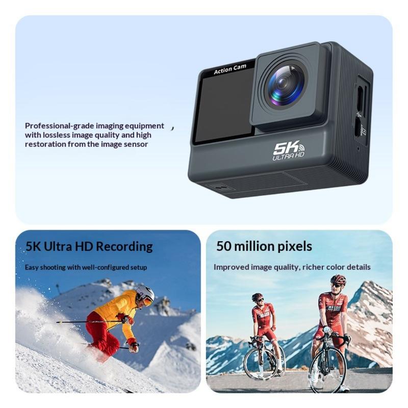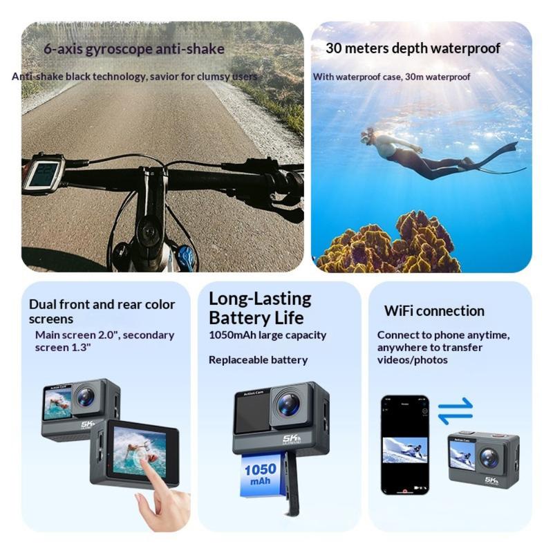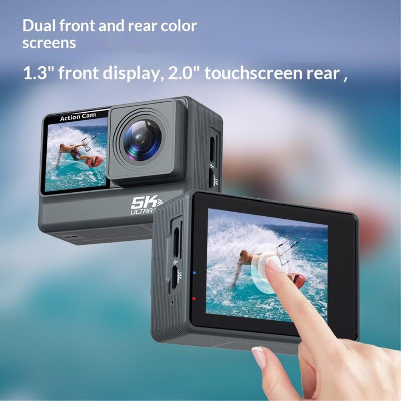 F308AATR Actionkamera med dobbel skjerm - 5K HD-sportskamera med 6-akset stabilisering, WiFi og vanntett etui