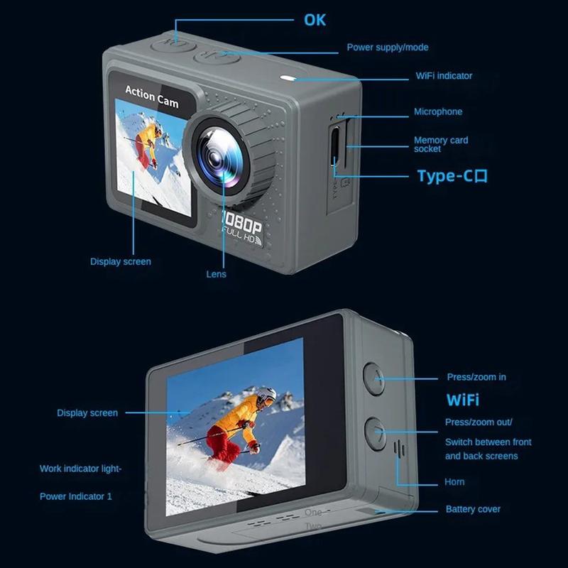 F502AA-G 2-tommers vidvinkel 1080P HD WiFi-actionkamera med 30 m vanntett etui