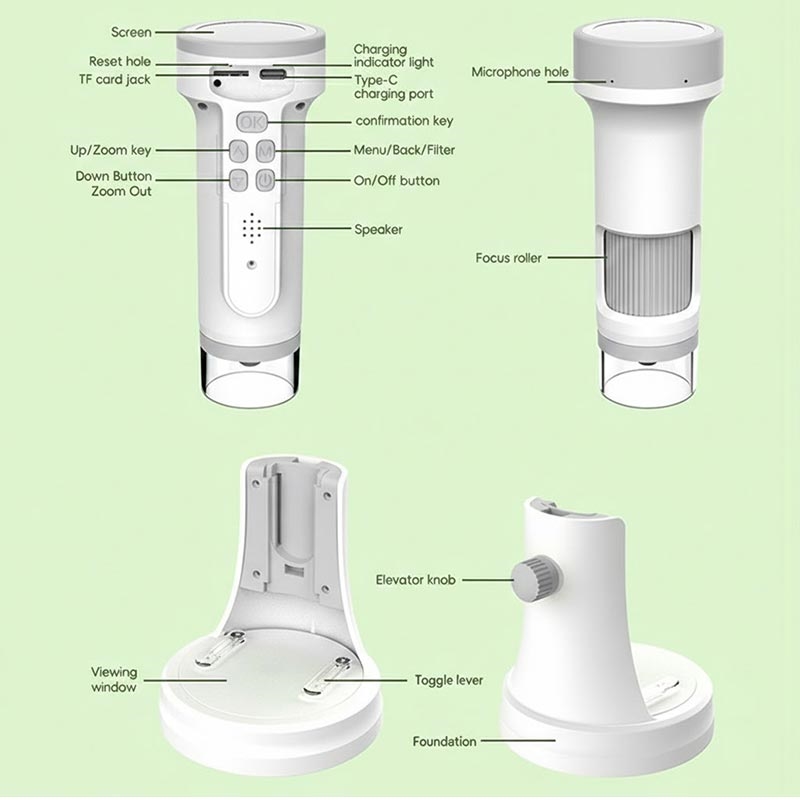 F9 digitalmikroskopet er et kompakt og lærerikt apparat som er utviklet for å introdusere barn og nybegynnere til den mikroskopiske verden på en morsom og tilgjengelig måte. Med både håndholdt og stasjonær bruk, en klar, rund IPS-skjerm og høyoppløselig foto- og videoopptak kan unge oppdagelsesreisende observere, fange og lære uansett hvor nysgjerrigheten melder seg - hjemme, på skolen eller utendørs.