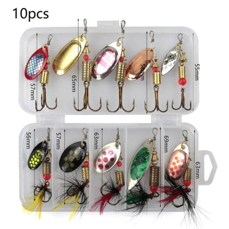 Fiskespinnesettet inneholder 10 metallsluk av høy kvalitet som er designet for å tiltrekke seg fisk med sin roterende paljettvirkning og realistiske bioniske utseende. Settet er kompakt og lett å ta med seg, og leveres i en praktisk oppbevaringsboks - perfekt for sportsfiskere som vil ha pålitelig utstyr når de er på farten. Hvert agn er utstyrt med skarpe trippelkroker som forbedrer fangsteffektiviteten og hindrer fisken i å unnslippe lett.
