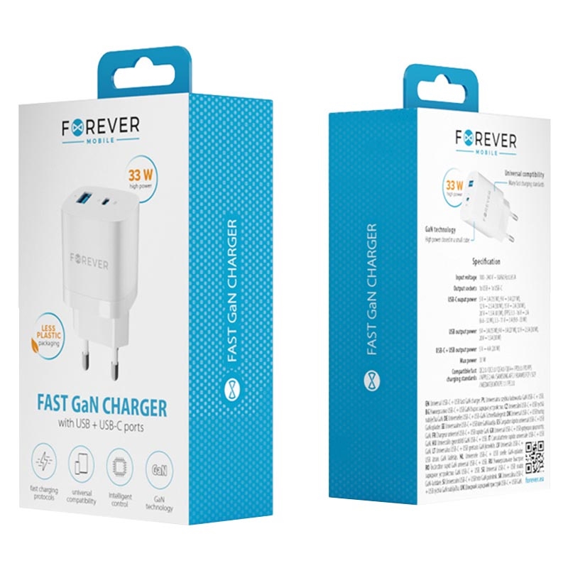 Forever GaN TC-05 Hurtig Oplader - USB, USB-C - 33W er den ultimate ladeløsningen for de som ønsker hastighet, sikkerhet og effektivitet i én kompakt enhet. Med sin avanserte teknologi og allsidige funksjoner, er denne laderen et must-have for enhver moderne bruker.