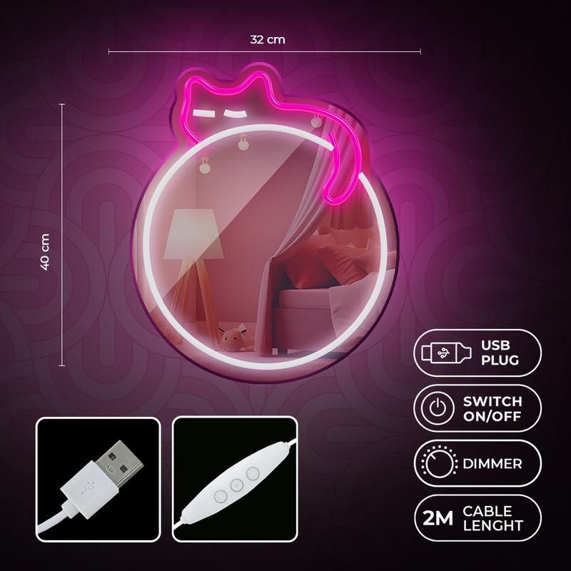 Neon MIRROR LED er en perfekt blanding av stemningsfull belysning og et praktisk speil omgitt av en stilig neonramme. LED-lyset skaper en koselig og avslappende atmosfære, noe som gjør speilet ideelt til både innredning og hverdagsbruk. Det allsidige bruksområdet gjør speilet til et iøynefallende møbel i servicesalonger så vel som i private hjem.