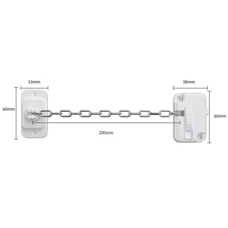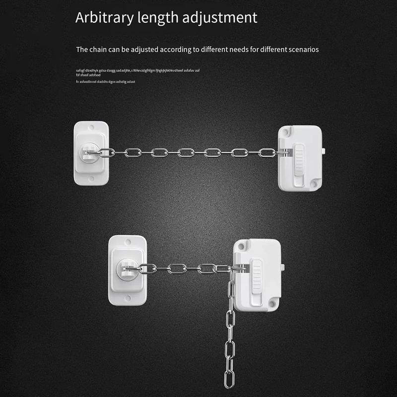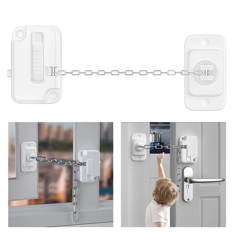 FT756 Adjustable Chain Safety Lock er utformet for å sikre vinduer, skuffer, skap og skyvedører, og bidrar til å forhindre at spedbarn og kjæledyr faller eller skader seg. Med sin sterke kjetting i rustfritt stål og slitesterke ABS-konstruksjon gir den pålitelig beskyttelse uten at det går på bekostning av ventilasjon eller bekvemmelighet.