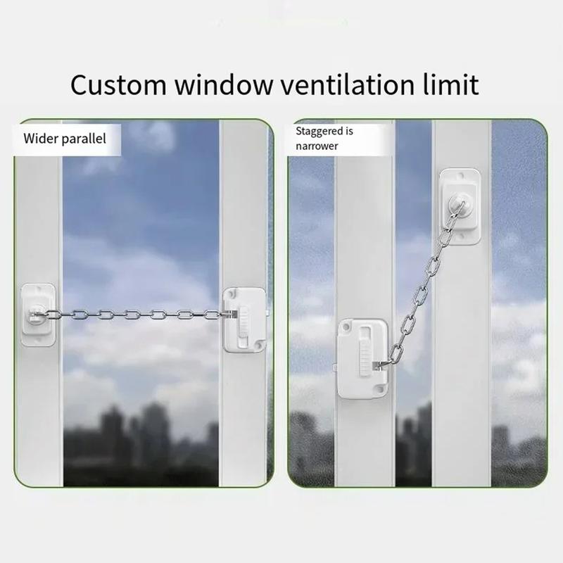 Den justerbare kjettinglengden gjør at du kan bestemme hvor langt et vindu eller en dør kan åpnes. Denne funksjonen sikrer god luftgjennomstrømning samtidig som den holder barn og kjæledyr trygt innendørs, noe som gjør den til et utmerket sikkerhetstilbehør for hjem og leiligheter.