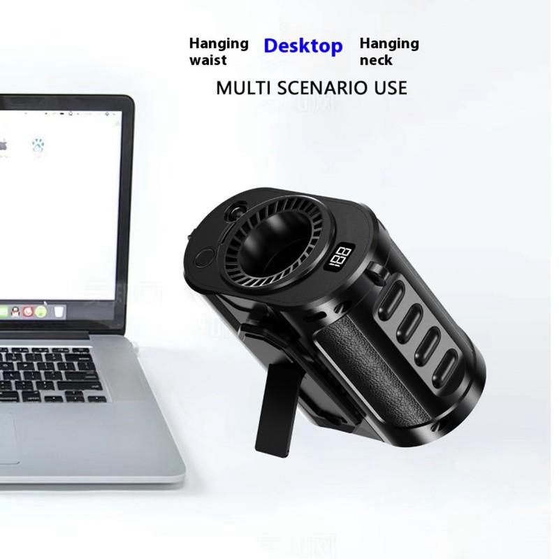 - Midjeventilator for håndfri kjøling, kan også brukes på skrivebordet med stativ