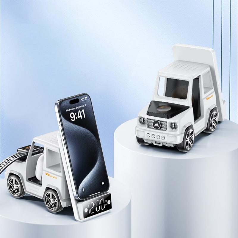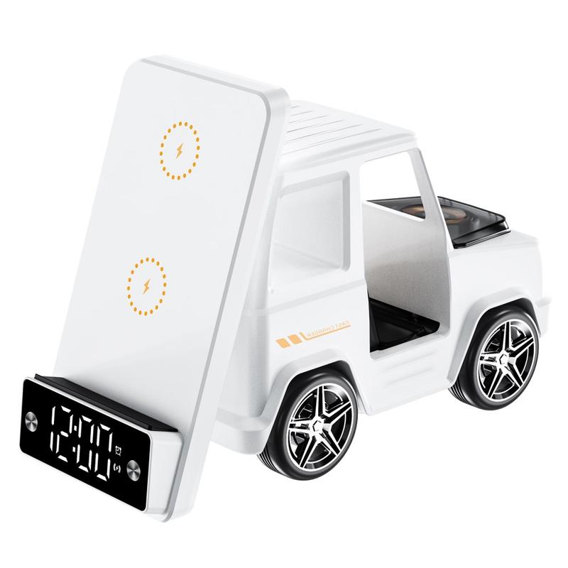 G63 Bilformet 15W trådløs lader med Bluetooth-høyttaler, klokke og stemningslys
