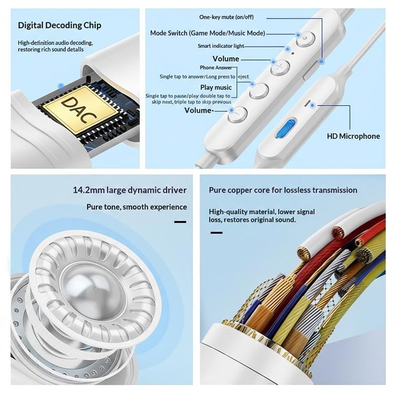 GC0098 Type-C kablede øretelefoner er designet for oppslukende spill og daglig musikklytting, og kombinerer kraftig lydytelse med praktiske funksjoner for daglig bruk. Utstyrt med en stor 14,2 mm dynamisk driver og en innebygd digital dekoderbrikke, leverer de klar Hi-Fi-stereolyd med dyp bass og detaljerte høyder. Med doble spill- og musikkmoduser, en stabil Type-C-tilkobling og et magnetisk design som forhindrer sammenfiltring, er disse øretelefonene et pålitelig valg for smarttelefoner, nettbrett og andre Type-C-enheter.