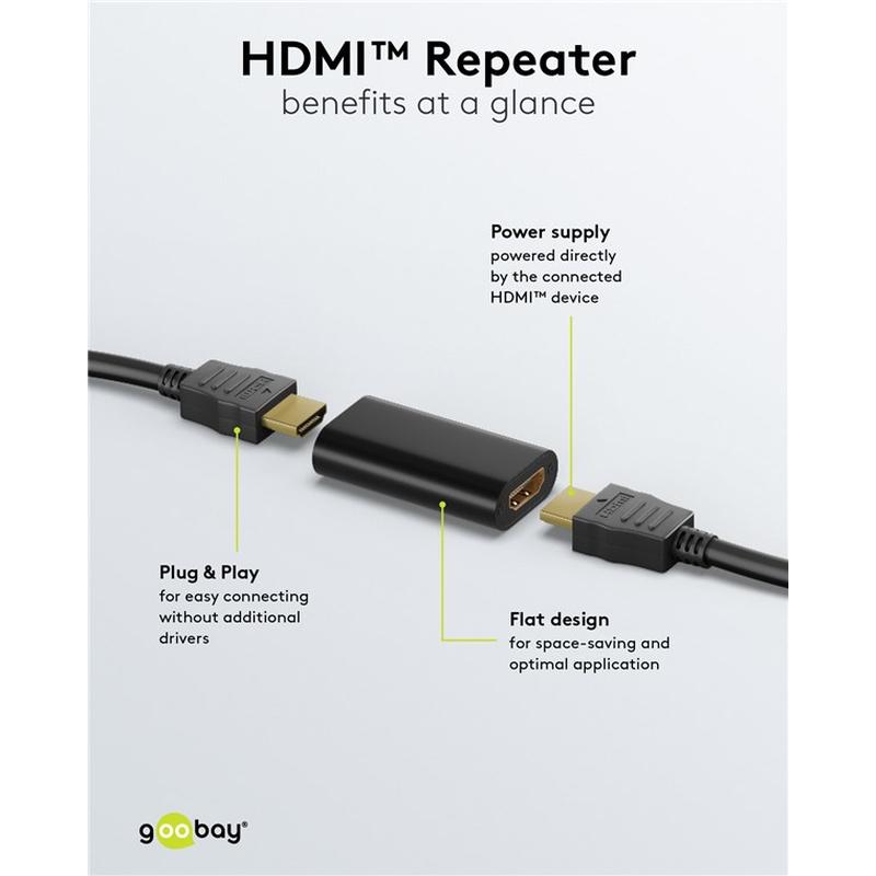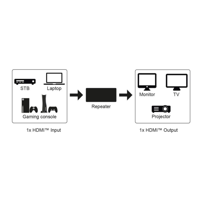 HDMI™-repeater øker nivået på svake HDMI™-signaler med 4K @ 30 Hz over et avstand på opp til 30 m og støtte 1080p 3D opp til 40 m, HDMI™-forsterker sikrere krystallklare bilde- og lydoverføringer også ved lange kabelstrømmer og skader effektiv signalstörningar eller brus. Ansluter t.ex. en datamaskin, bærbar datamaskin, Blu-ray-spiller, DVD-spiller eller spillkonsoll til en utgångsenhet, t.ex. no TV (HDTV), monitor eller projektor. Passiv HDMI™-signalforsterker som krever noen ekstern strømforsørging siden stasjonene er koblet til HDMI™-enheten. Platt metallhölje for ekstra motstandskraft, Plug & Play muliggjør enkel anslutning uten installasjon av ytterligere driverrutiner, Guldpläterte anslutninger for korrosjonsbeskyttelse og beste mulige signaloverføring