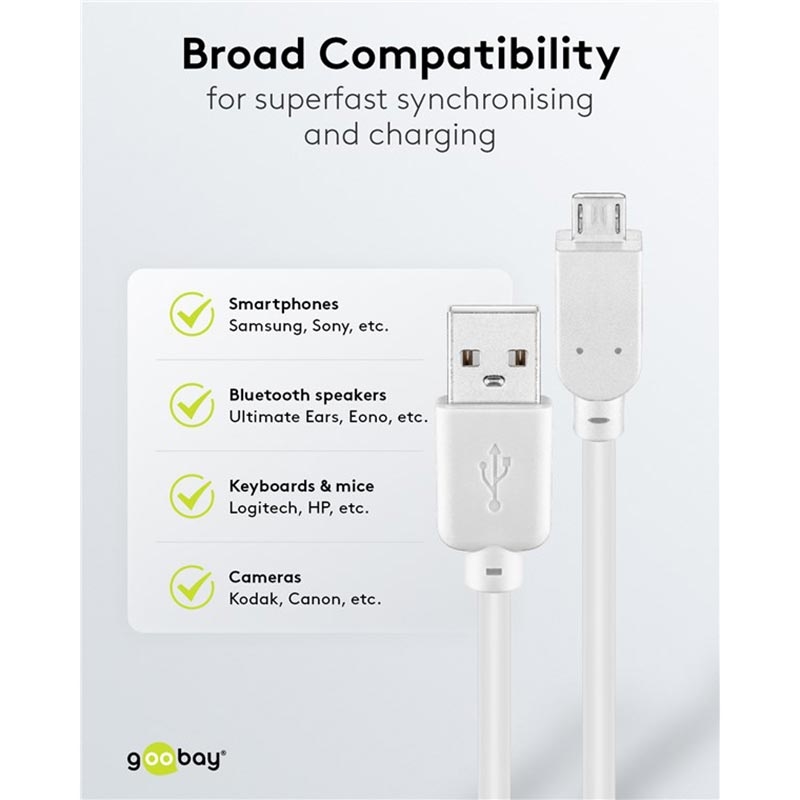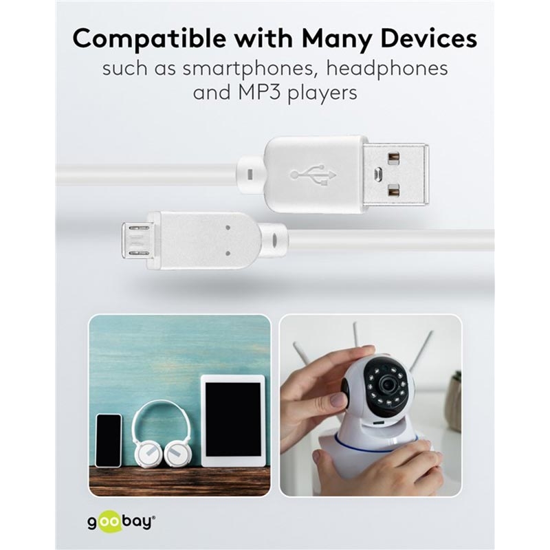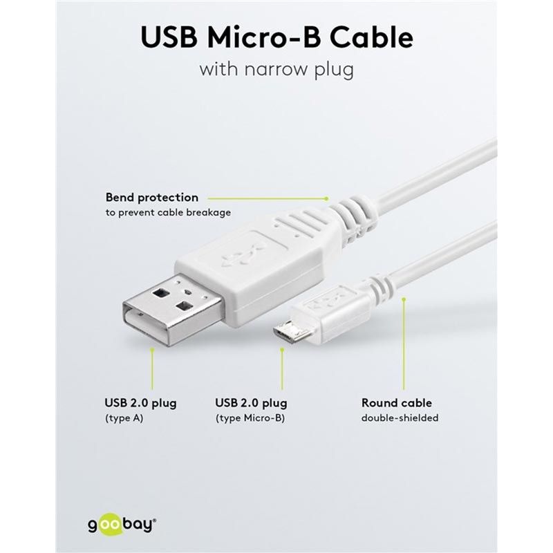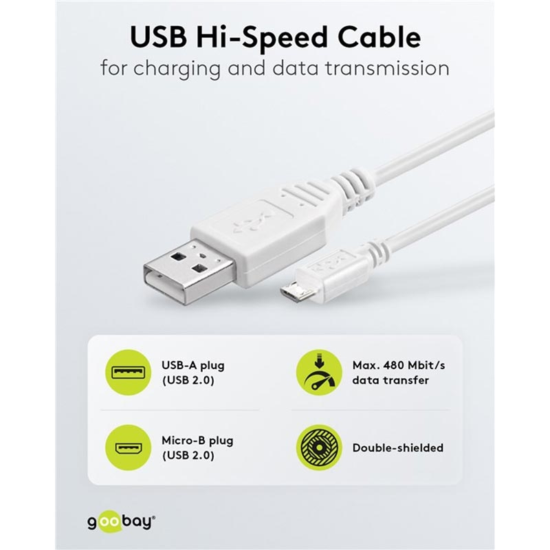 Goobay USB 2.0-hankabel til microUSB-hankabel er utviklet for synkronisering og lading. Kabelen muliggjør dataoverføringer på opptil 480 Mbit/s og er bakoverkompatibel med USB 1.1 for økt fleksibilitet. Kabellengden er 1m. Kabelen er merket med CE- og WEEE-sertifiseringer.