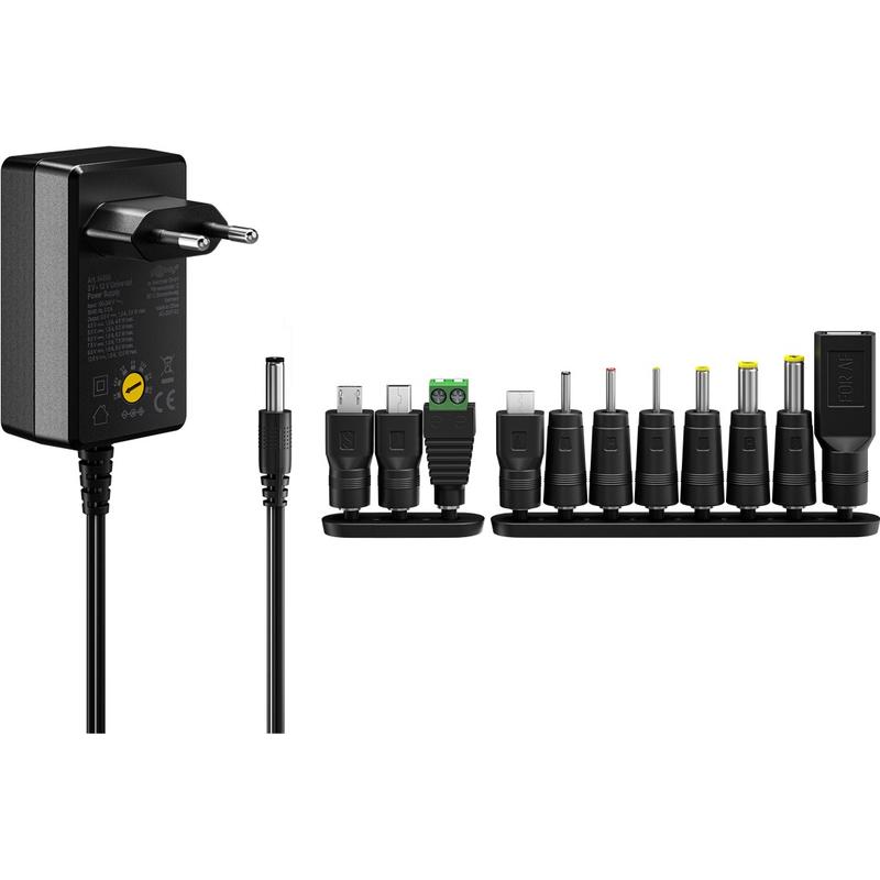 Goobay Universal Power Supply er designet for optimal kompatibilitet og bekvemmelighet, og håndterer spenninger fra 3 V til 12 V uten problemer, samtidig som den leverer maksimalt 12 W/1,0 A. Med 11 medfølgende adaptere - fra klassiske DC-stikkontakter til banebrytende USB-C - gir den en enkelt, pålitelig løsning for strømforsyning av ulike små enheter som rutere, LED-striper, bærbare radioer eller batteriladere.
