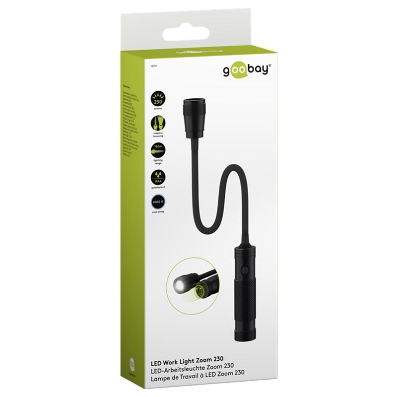 Utstyrt med en magnet på bunnen og en 33 cm lang fleksibel kabel, er Goobay Zoom 230 LED arbeidslys en praktisk gadget når du trenger lys og begge hender fri. Juster lyskjeglen med en glidemekanisme for mer effektivt retningslys. Goobay Zoom 230 fungerer med tre LR03 AAA-batterier (ikke inkludert).