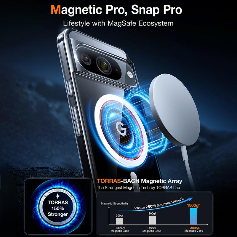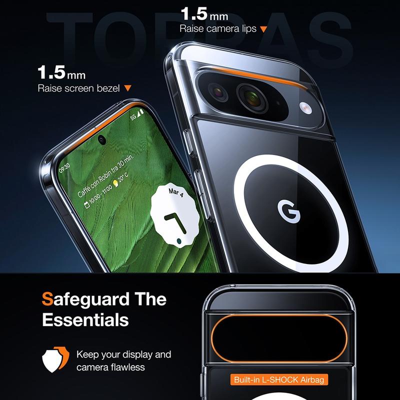 Torras MagSafe-kompatible gjennomsiktige TPU-etui for Google Pixel 9, Pixel 9 Pro kombinerer stil, beskyttelse og funksjonalitet, noe som gjør det til det perfekte valget for brukere som ønsker et slankt, slitesterkt etui som fremhever telefonens design samtidig som det er MagSafe-kompatibelt.