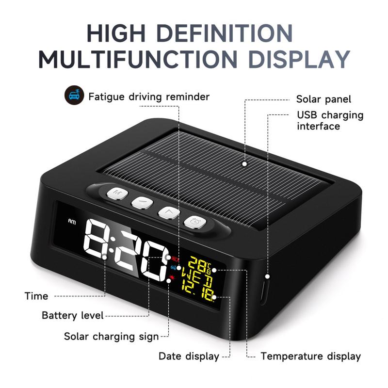 GS-301 Solcelledrevet LED-digital vekkerklokke med temperaturvisning og påminnelse om tretthet ved kjøring