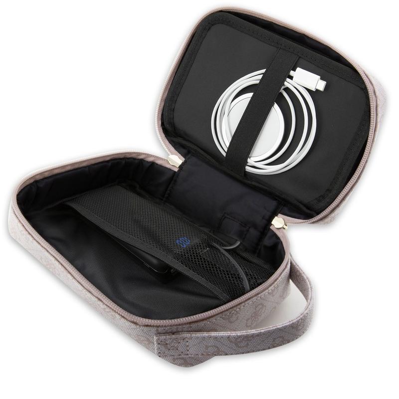 Guess Travel Universal-vesken er det ideelle reisefølge for alle som ønsker en stilig og praktisk måte å ta med seg alt tilbehøret til telefonen, nettbrettet eller den bærbare datamaskinen på. Vesken er laget av ECO-lær av høy kvalitet og har en fin strukturert overflate med den ikoniske Guess-logoen. Innvendig er det godt utformede lommer som gir god plass til ladere, powerbanks og strømkabler. Det spesielle med denne vesken er USB-A-utgangen, som gjør det mulig å koble til en powerbank og lade telefonen direkte fra siden av vesken. Med sitt stilrene design er denne vesken perfekt for reisende som setter pris på både funksjonalitet og mote.