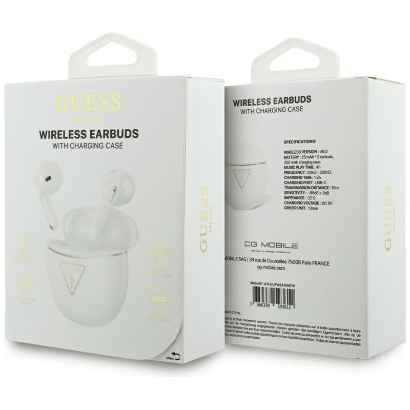 - Ekte trådløs in-ear-design med et eksklusivt Guess Gold Line Triangle-utseende
