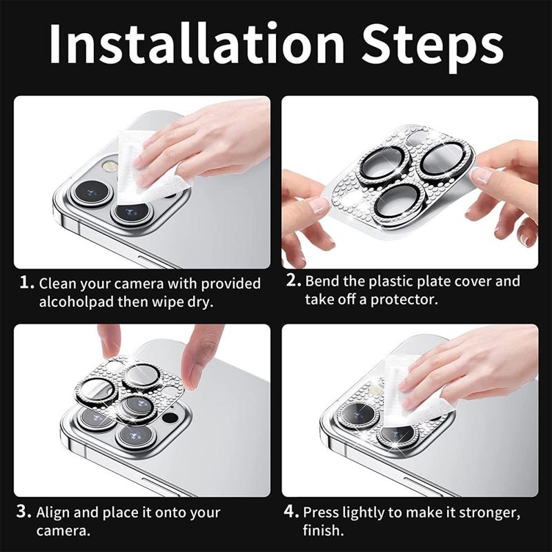 Denne kamerabeskytteren er laget av premium herdet glass med 9H hardhet, plassert under den slitesterke aluminiumslegeringsringen dekorert med skinnende rhinestones. Den er nøyaktig laget for å passe perfekt til kameralinsene på din iPhone 15 Pro, iPhone 15 Pro Max, med høy gjennomsiktighet slik at den ikke påvirker kvaliteten på tatt bilder og videoer.