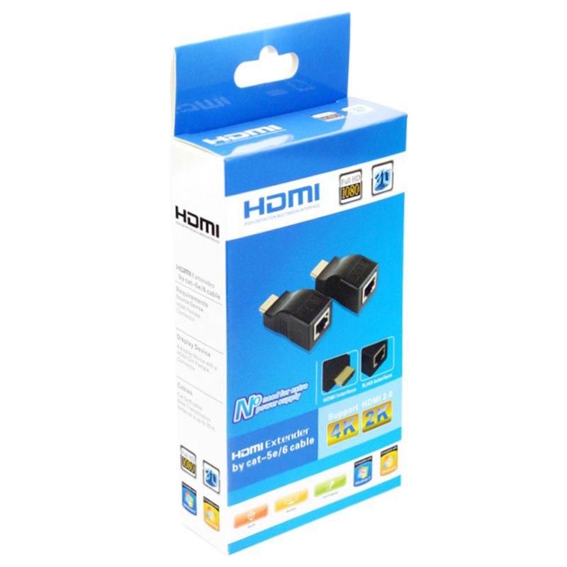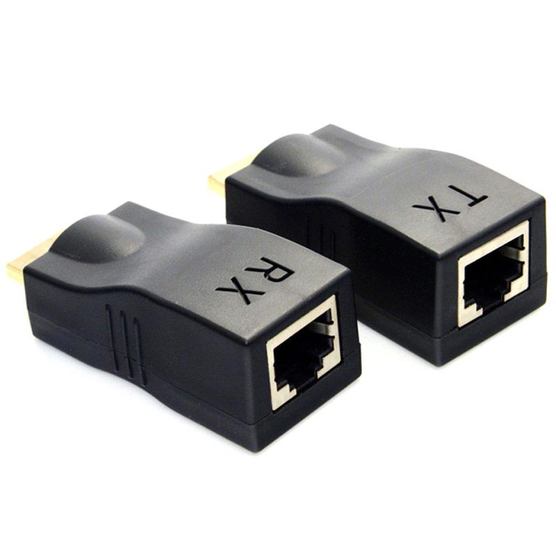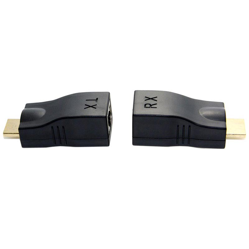 Disse høykvalitets HD-208 RJ45 til HDMI-forlengelsene tilbyr deg muligheten til å utvide HDMI-signalene opptil 30 meter ved bruk av Cat5e eller Cat6 nettverkskabler. De er utstyrt med en sender- (TX) og en mottaker- (RX) enhet med et HDMI hann til RJ45 hunn grensesnitt. Bare plugg senderen inn i enheten som deler signalet, plugg mottakeren inn i enheten som vil motta signalet og koble den til med din egen LAN-kabel.