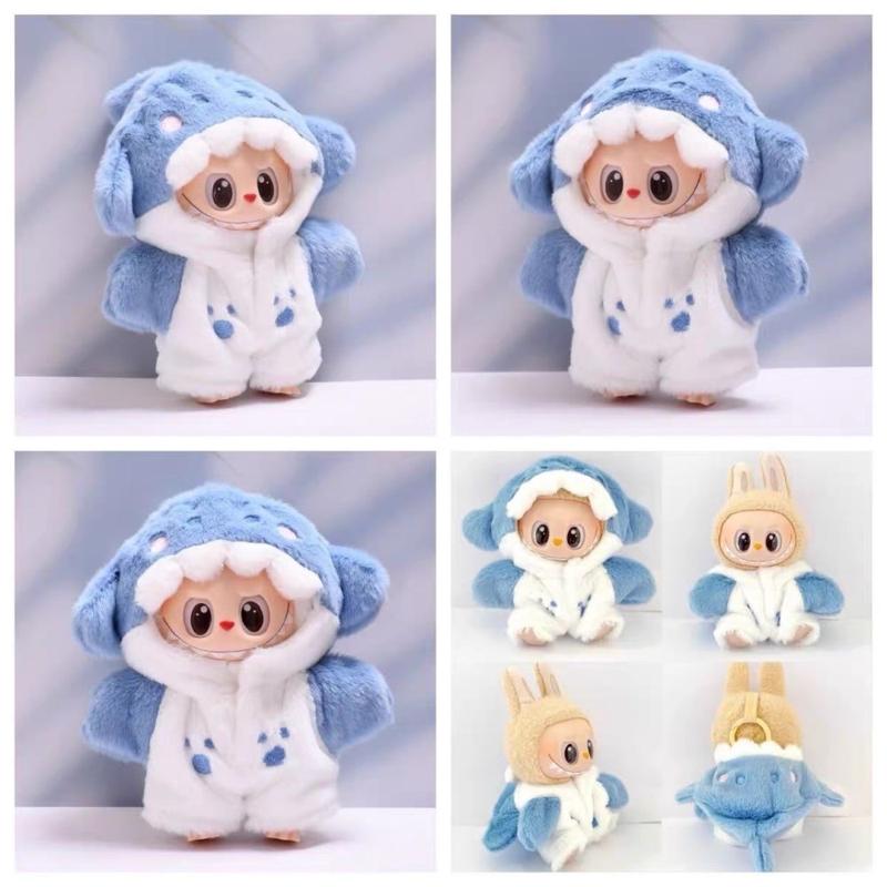 Hai hette jumpsuit for Labubu dukke 17cm - søt plysj pyjamas kostyme for mini figurine