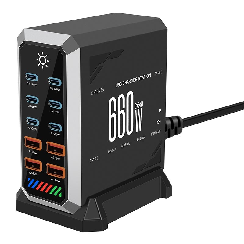 HHW HW18 660W GaN multiport bordlader - Smart USB strømadapterstasjon med digital skjerm - 6xUSB-C, 4xUSB-A