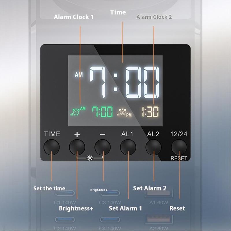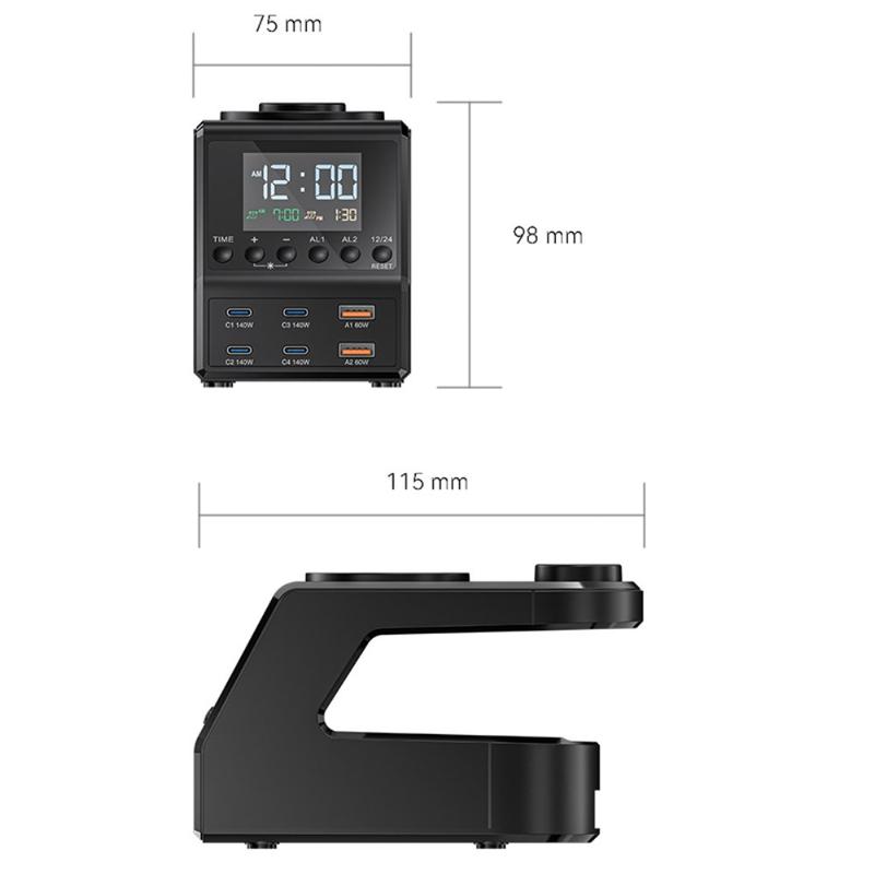 - 6-i-1 multifunksjonell design - Kombinerer vekkerklokke, trådløs lader og multiport-strømstasjon.